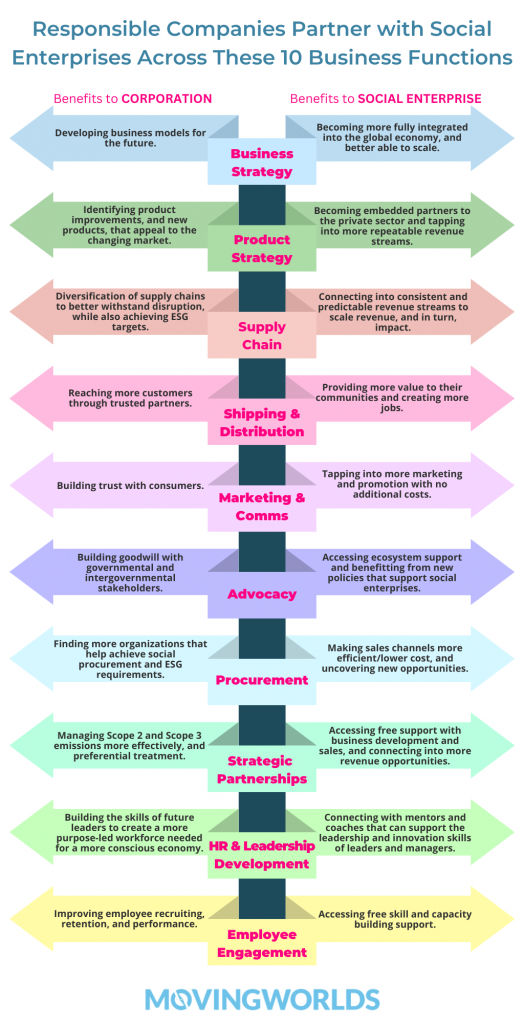 The following table summarizes the key benefits to corporations and social enterprises when they partner together across the 10 functions above: