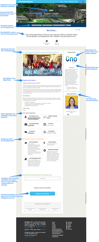 While we know that it takes time to post a quality opportunity, we are committed to helping you. If you follow these guidelines, the likelihood of being matched to the right Experteer will drastically increase. In addition, we'll be likely to feature your opportunity on our homepage, write about you in our monthly Partner Spotlight series, and promote you on our social media channels. Our hope is that in addition to being matched to an Experteer, you'll also get more attention for your organization and cause. Watch this video for a tour of the site, and for more information about posting opportunities, and see the image below which shows that your profile will look like on MovingWorlds.