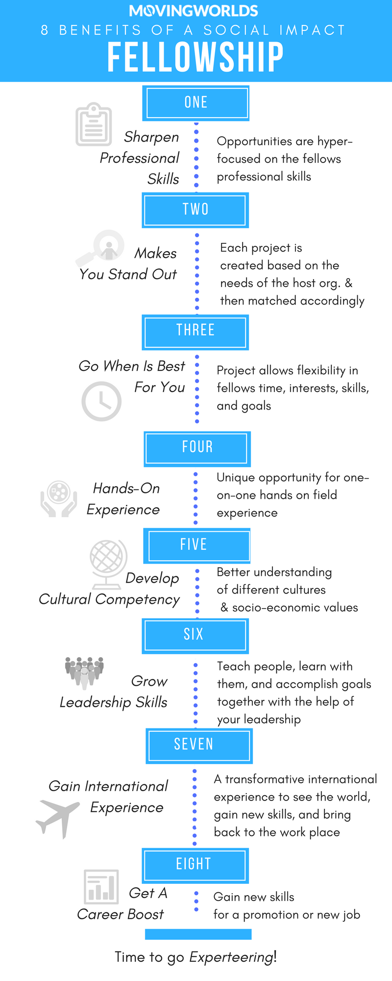 Check out the infographic sharing 8 benefits of these programs, and if you’re looking to join a Fellowship, scroll to the bottom of this post to learn more about the MovingWorlds Institute Global Fellowship and a list of other great options.