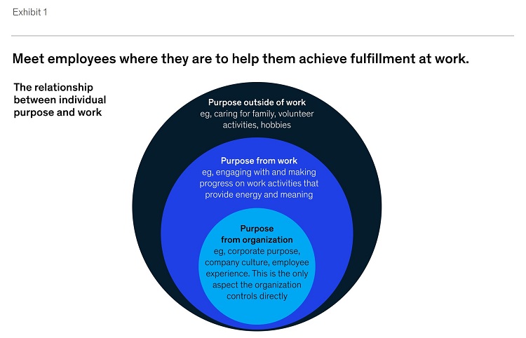 The McKinsey report goes on to explain that it’s this innermost circle that represents the company’s means of influence as it’s the only aspect of purpose that organizations control “By establishing a corporate purpose that considers the company’s role and contribution to society, and by providing employees with meaningful ways to reflect on the company’s efforts and their impact. Companies can also exert influence by improving the underlying health of the organization and its culture, bolstering inclusiveness and the employee experience, and changing the work itself.”