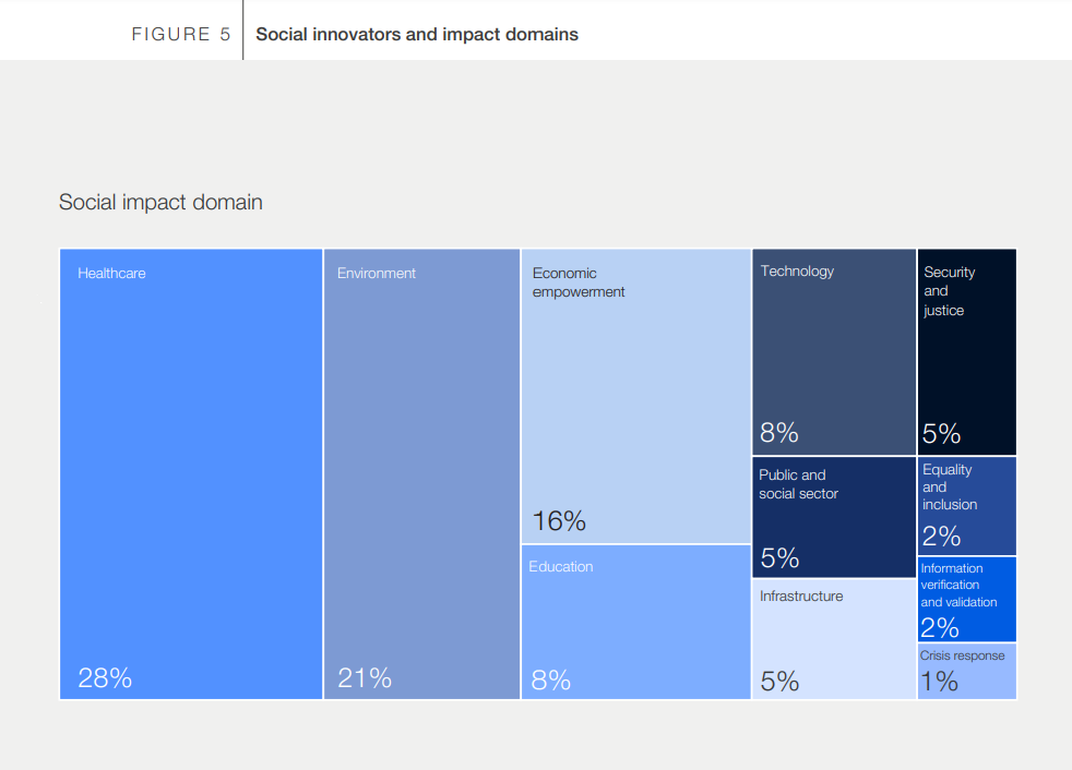 The three most common impact areas where AI is driving social innovation are healthcare, environment, and economic empowerment. Together, they represent about 65% of all innovators surveyed.