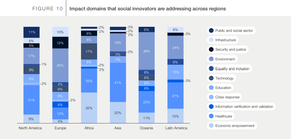Interestingly, Europe’s share of women-led social innovators deploying AI is significantly lower than the global average, trailed only by Latin America.