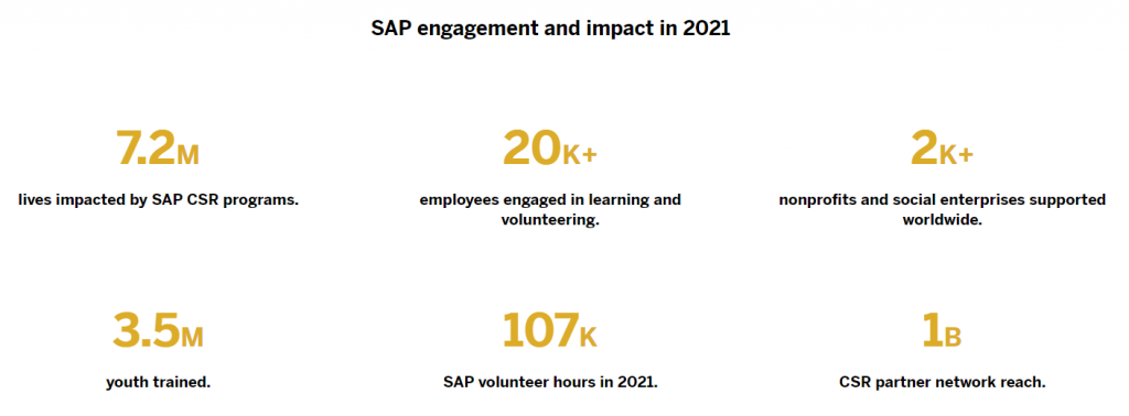 Internal employee survey data shows that 94% of SAP employees believe in its corporate purpose to help the world run better and improve people’s lives. To support them, SAP significantly invests in connecting employees to their purpose, growing their skills, and achieving both their personal and professional goals while cultivating an inclusive leadership culture. Last year, more than 20,000 employees volunteered their time and expertise. In fact over the last decade, employees have dedicated 100,000+ hours to pro bono consulting engagements globally through programs like the SAP Social Sabbatical. Leveraging the TRANSFORM Support Hub, SAP has been able to scale programs like its Acceleration Collective to increase sense of purpose, broaden perspectives, and facilitate a two-way exchange of innovation for its global employee base. (For more about the impact of these programs, read the case study here.)
