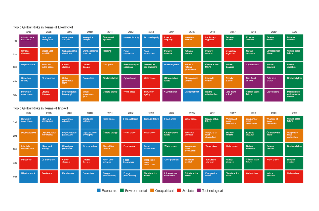 The World Economic Forum put out its global risk report, and it's not pretty, with the threat of climate issues taking up the vast majority of the report (see the image below where green boxes = environmental issues)