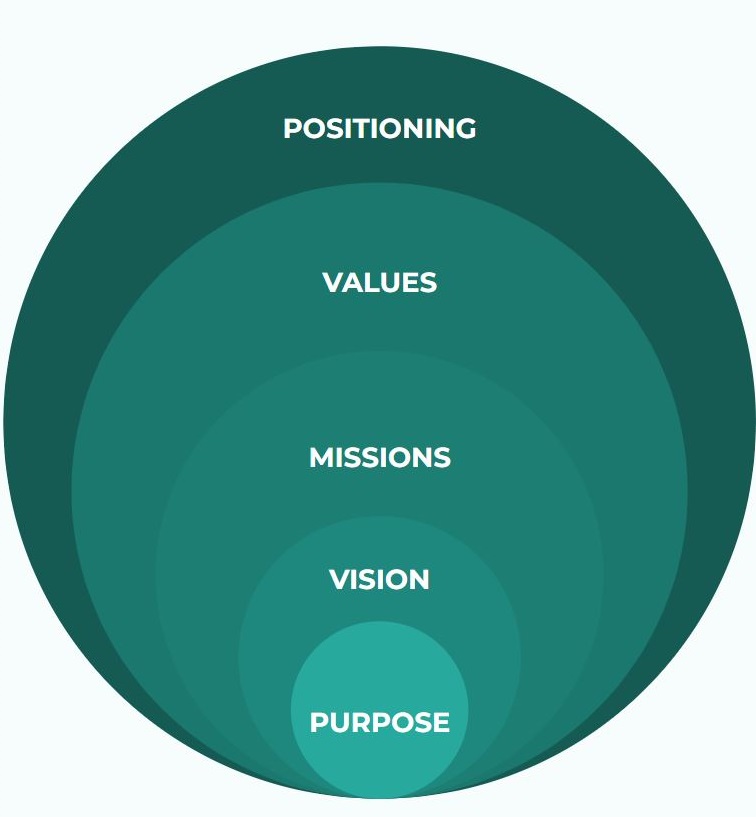 Successful branding and positioning builds on your brand’s purpose, vision, mission, and values. Here is a helpful visual from our Branding & Positioning guide that demonstrates how each of these elements relate to and build on each other: