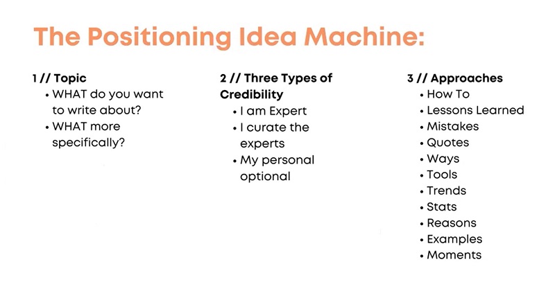 To help you come up with ideas to put content out there to better position your enterprise online and in the world, Andrew introduced a simple framework called “The Positioning Idea Machine.” It has 3 components: