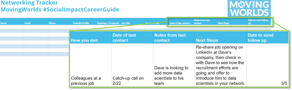 For example, imagine you used the template above to set up a catch-up call with an old colleague named Dave. During your catch-up, you learn that Dave’s biggest focus right now is adding more data scientists to his team. Afterwards, you would record the date of your catch-up call in the ‘date of last contact’ column, and record the information Dave shared with you in the ‘notes from last contact’ column. In the ‘next steps’ column, you could add something like “re-share job opening on LinkedIn at Dave’s company, then check in with Dave to see how the recruitment efforts are going and offer to introduce him to data scientists in your network.” From there, you would add a date to the tracker for when you should complete it by.