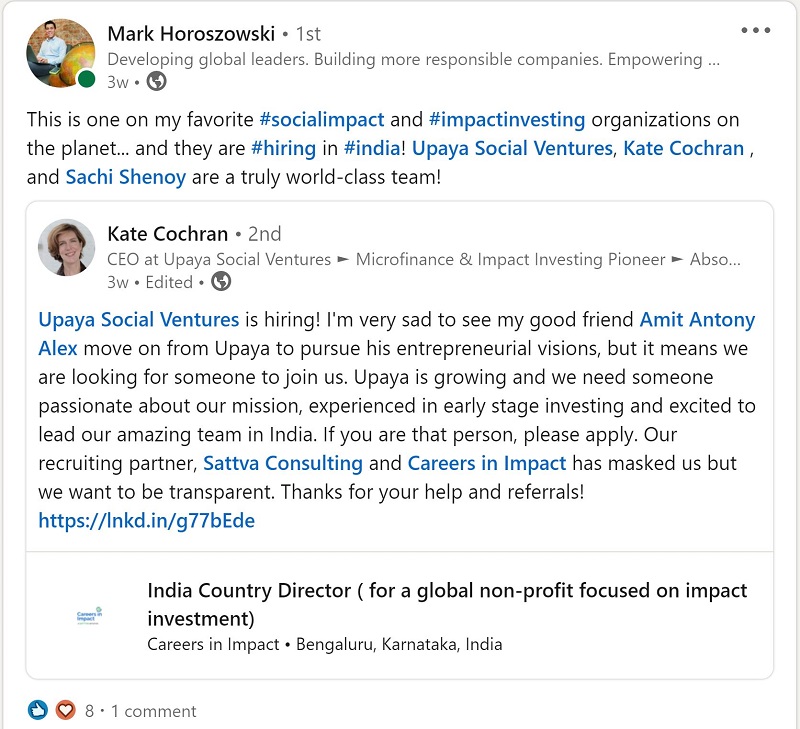 Why we like this example: Re-sharing an interesting job opportunity is a great way to show support for the hiring organization and your contacts there, while also adding value to people in your network who are job searching.