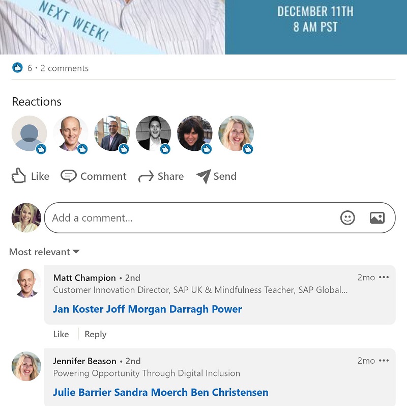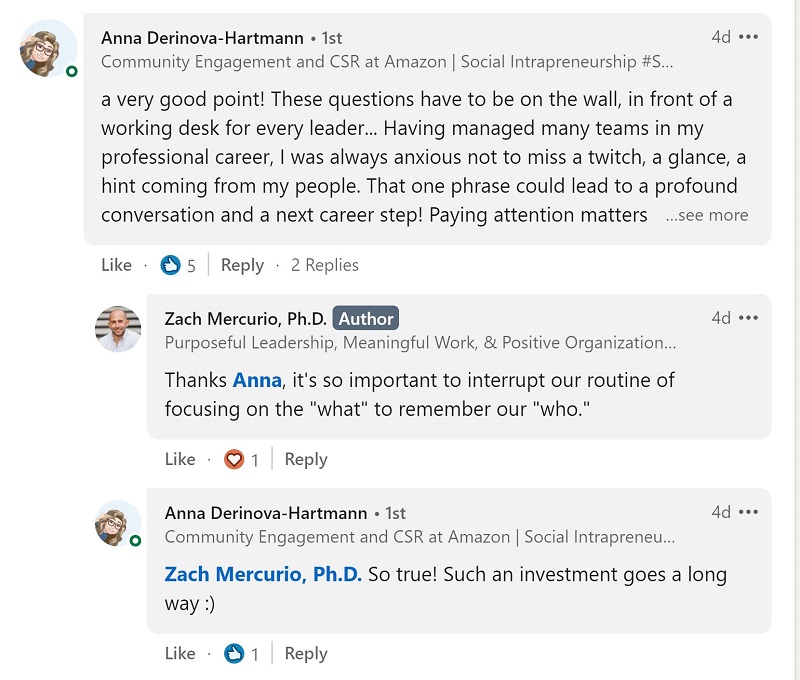 Why we like this example: By commenting on a thought-leader’s post with her own relevant experience, Anna is helping the original post get more traction and engagement, while also increasing her visibility among the original poster and others interested in the same topic.