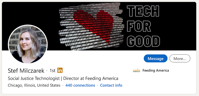 Based on the image and text in the background image, it’s immediately clear that Stef works in tech for good, and is a valuable signal for people who may be interested in the same thing and want to connect with her. (Editor’s note: to learn how Stef pivoted her career to tech for good, check out her career change story here.) For more inspiration, check out the examples and suggestions for background images here.