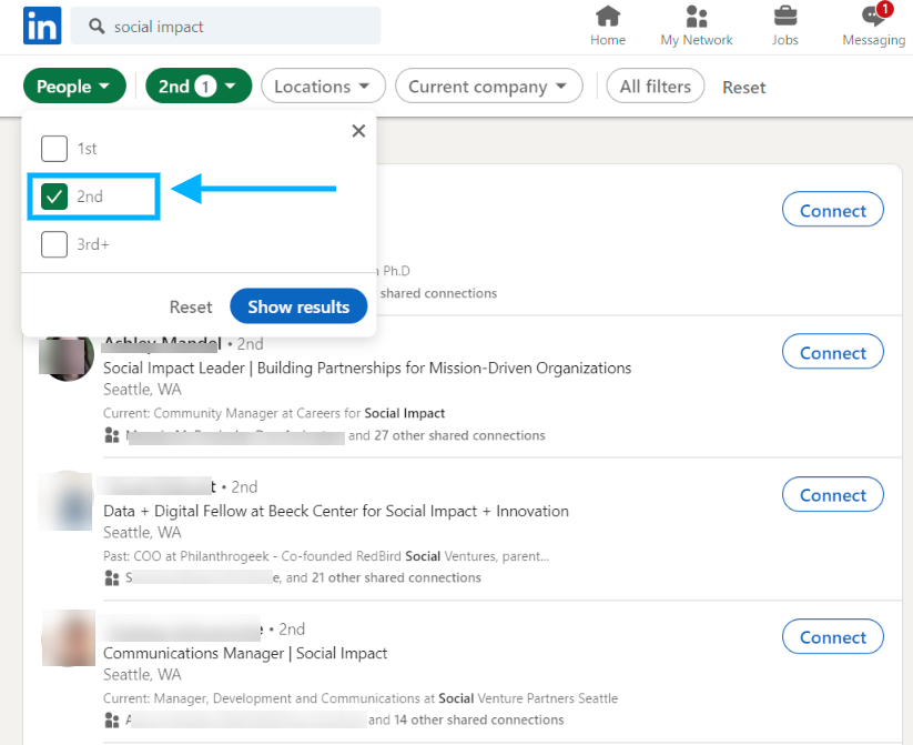 In the same way that dormant ties can be more valuable than strong ones, second degree connections can also add tremendous value. To look at potential mutual connections you would like to be introduced to, search keywords related to the roles or industries you’re interested in and filter by second-degree, as shown below: