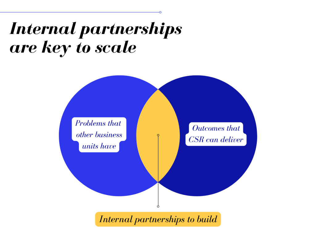 These partnerships not only amplify your impact but also help secure buy-in from influential stakeholders. As an example, the CSR leader at one of our corporate partners has internal partnerships with HR, Sales, Leadership Development, and Tech units who expose their employees to skills-based volunteering programs because they see how it helps their employees remain customer centric and become more innovative.