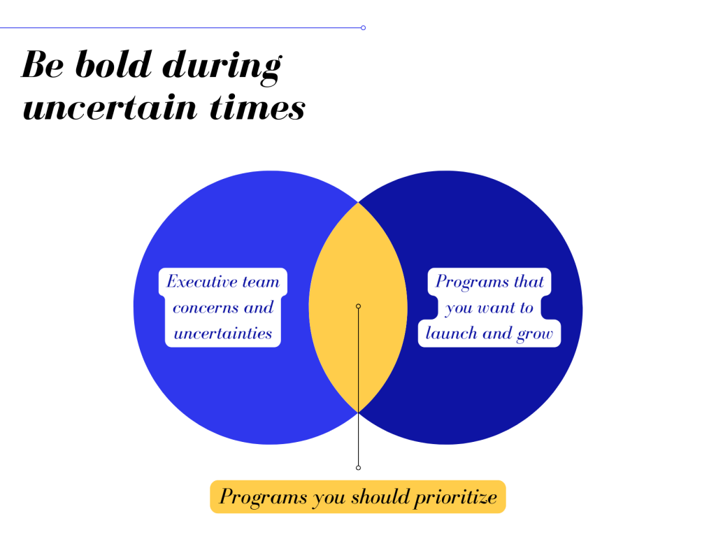 Collaboration across departments not only strengthens your programs but also garners additional resources and advocates. Look for shared goals: as an example, if your program supports sales, partner with your Chief Revenue Officer or marketing team. Or, if your initiatives drive innovation, collaborate with product or business development teams.