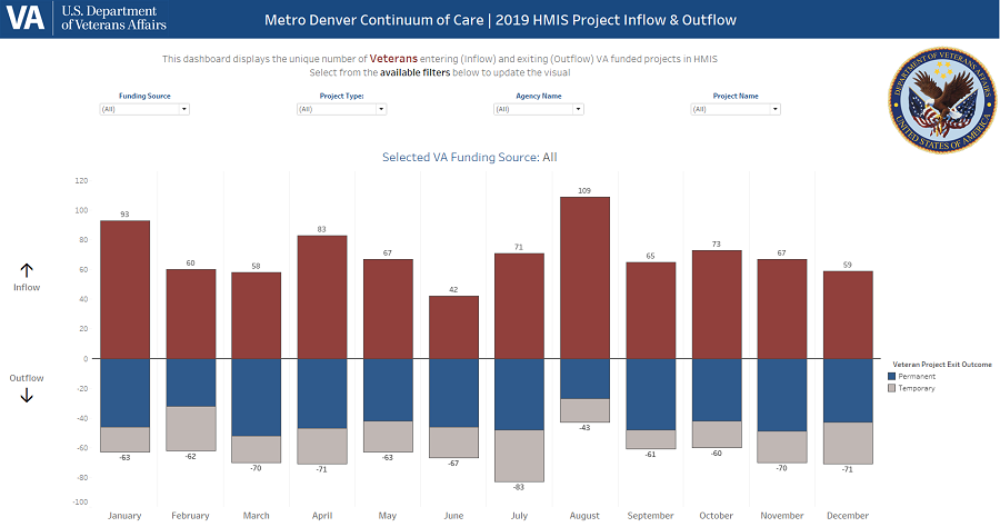 Building on his training from the Mission Project, Matt and his team dove into their data to create the first iterations of dashboards to share within their community. The first visualization shows how many veterans were enrolled in projects funded by the Department of Veteran Affairs (VA) in 2019. The second visualization represents the flow of those veterans into and out of VA-funded projects over the same time period. Together, these reports allow any agency in the homeless crisis response network to gain an in-depth understanding of the types of services being utilized (or not) by that specific sub-population and identify opportunities for improvement.