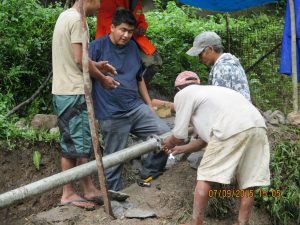 The reason for the big team involvement on this occasion is that the pump has been destroyed beyond repair. It needs to be replaced, which involves new parts and additional labour, which of course incurs a cost that must be approved by an official meeting of the association.While waiting for this meeting we went to go have a look at the pump. We travel in convoy, led by the vice-chairman of the barangay and three women from the association in their flips-flops, including the guys from the technical team in their bare feet, and one web developer in his hiking boots, sweating buckets and taking pictures of the trees. We walked down the main street of the Barangay, and then turned left, into what looked like someone’s garden. Then down a steep path, across a bridge, up a hill, left through a field of crops, down another path… Well, you get the picture. The pumps themselves are installed at a location convenient to the source. Not necessarily right at it but close, and at a lower altitude, so that gravity can provide the pump with a steady flow. The pumps then use that gravity and science to deliver the water to communal faucets and a reservoir at a location that is actually convenient to the broader community, in this case, about two kilometres away and 80 metres higher.