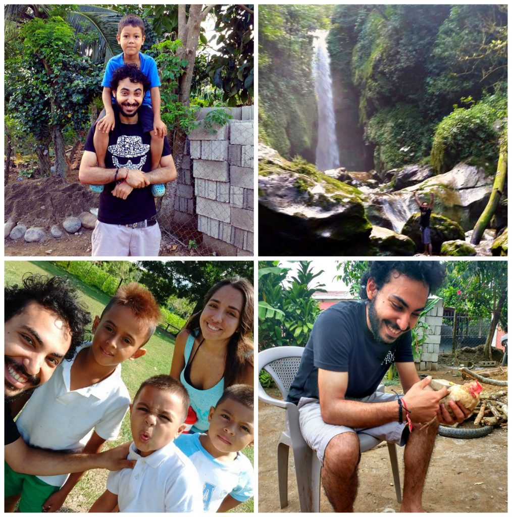A collage of Rustom and his Experteering experience. Clockwise from upper left, Rustom with a student, Honduras scenic waterfall, at the school with pet, and with students and another volunteer.[/caption]