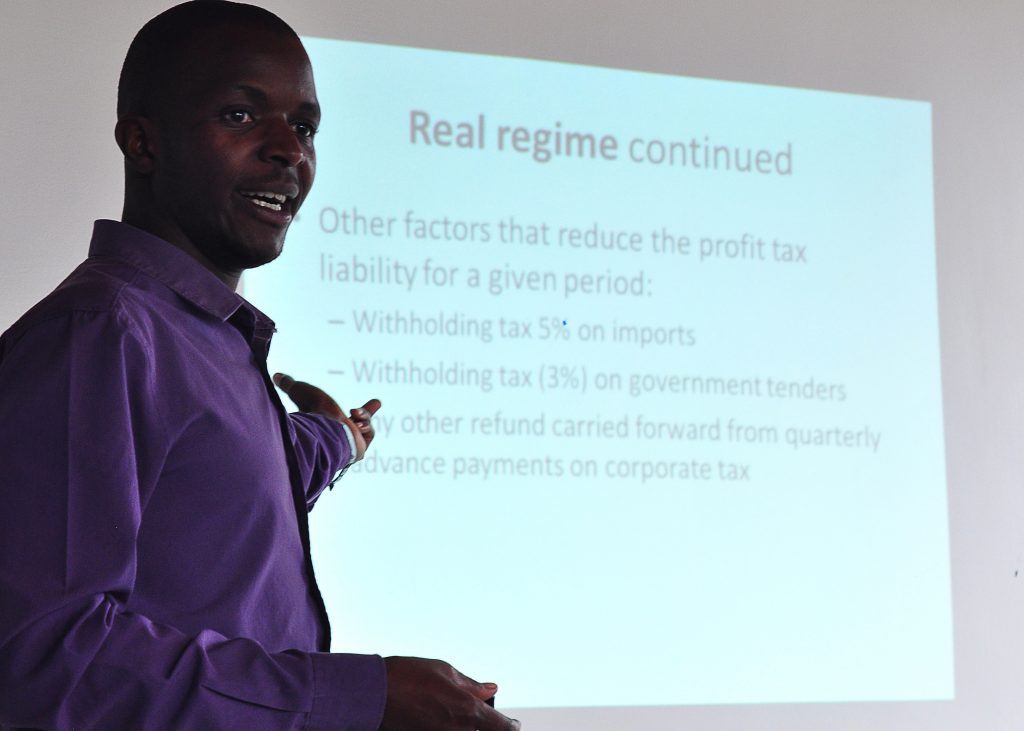 Osman Senyonjo, a business development associate and taxation expert gives a training to Rwanda entrepreneurs at AEC's offices in Kigali.[/caption]