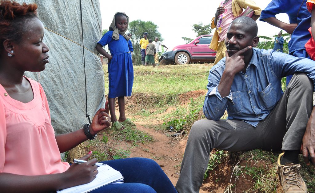 Olive Ashimwe, a business development associate at AEC, discusses potential business challenges with a coffee farmer client in Rwanda's eastern province.[/caption]