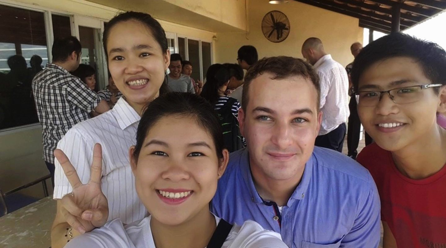 Matt Edward with some students. He currently lives in Vietnam with his wife and works as an English teacher. For a "Vacation", he went to Rwanda to support local entrepreneurs. He and his wife plan to start their own business in the Vietnam in the coming months.[/caption]