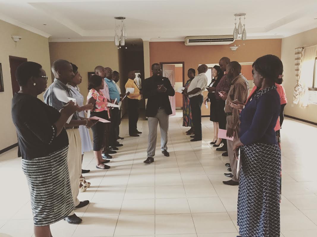 Maurice Nyambe leading an ice-breaker during the 2-day Monitoring and Evaluation training for grant partners.[/caption]