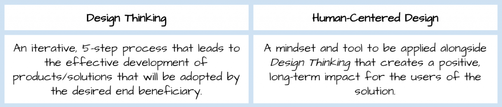 Design Thinking was as originally popularized by IDEO for creating commercial products (like the original apple mouse), and it is typically used to create market-based products and/or services. Human-Centered Design takes this a step further and provides a mindset and tools to ensure these products and/or services actually improve the lives of the end-users or beneficiaries. Combined, they offer a process and mindset that creates self-sustaining solutions to some of the world’s greatest challenges.