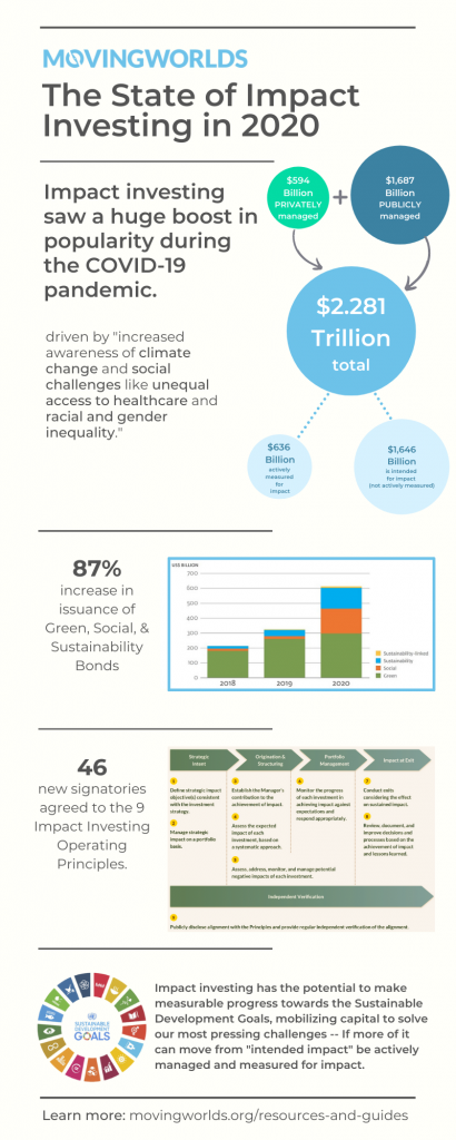 As with everything else in the impact investing world, there is still a significant amount of ambiguity and rapid pace of change. But the significant takeaway here is that the pandemic has spurred more mainstream adoption of financial instruments that take social and environmental impact into account more than ever before.