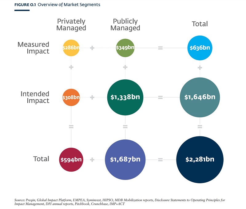 The graphic above shows the breakdown of the total impact investing market based on whether the assets are publicly or privately managed, and whether investments are ‘measured impact’ or ‘intended impact.’ As we elaborate on in this video, impact measurement exists on a spectrum, with different levels of rigor. And that’s the case for impact investments, too. We’ll share more about the difference between measured and intended impact in the next section.