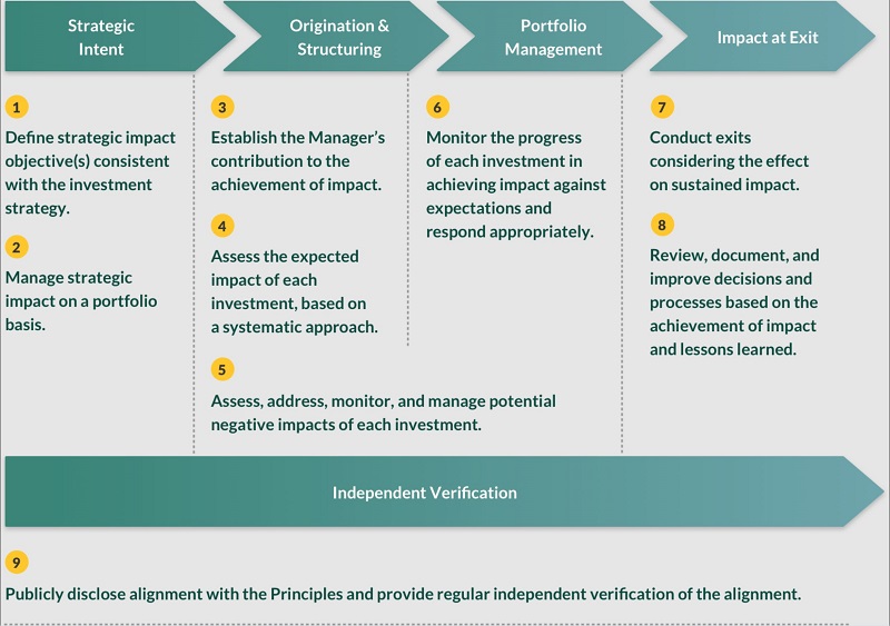 To help remedy that, in 2019, the Operating Principles for Impact Management (aka “Impact Principles”) were established as a framework to guide investors in the design and implementation of their impact management systems, ensuring that impact considerations are integrated throughout the investment lifecycle (not just in the marketing.) You can read more about the 9 impact investing principles here and see a summary in the graphic below: