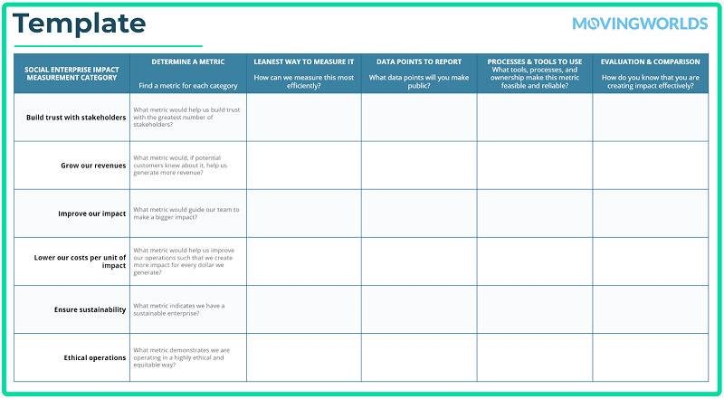 At the end of the guide, we share six steps you can take to begin and/or improve on the way you measure and report on impact at your social impact organization. Each step is explained in more detail in our social impact measurement guide here, and we even include a template that you can download at the end of the guide: