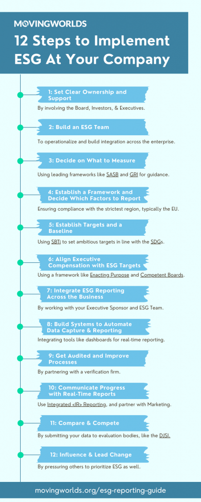 We wrote our new ESG Reporting Guide to help you cut through the noise by sharing only the most relevant context, background, frameworks, and examples. At the end, we recommend the following 12 steps to help you think through the best way to implement and/or improve ESG reporting at your company: