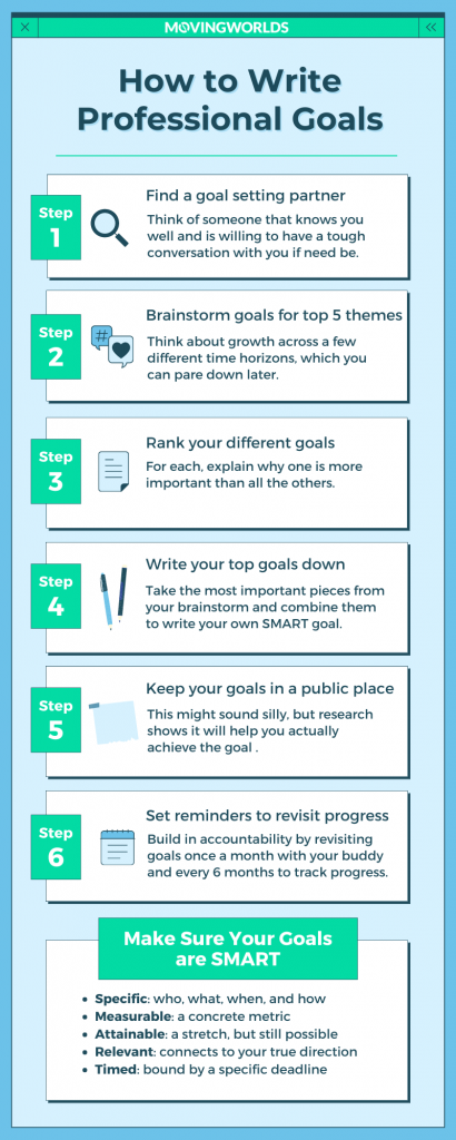 The good news is that it’s never too late to get started, and with a little introspection and practical guidance, you can develop and start working towards goals to take your career to the next level. In our work with professionals through the MovingWorlds Institute, we’ve seen that taking the time to set goals is a small shift that makes a big difference: as Global Fellowship alumna Anna shared, “[The Fellowship] was the first time in my entire career that I sat down to write out my goals and purpose. That level of introspection made all the difference – before, I was going with the flow, and now, I was defining the flow for myself.”