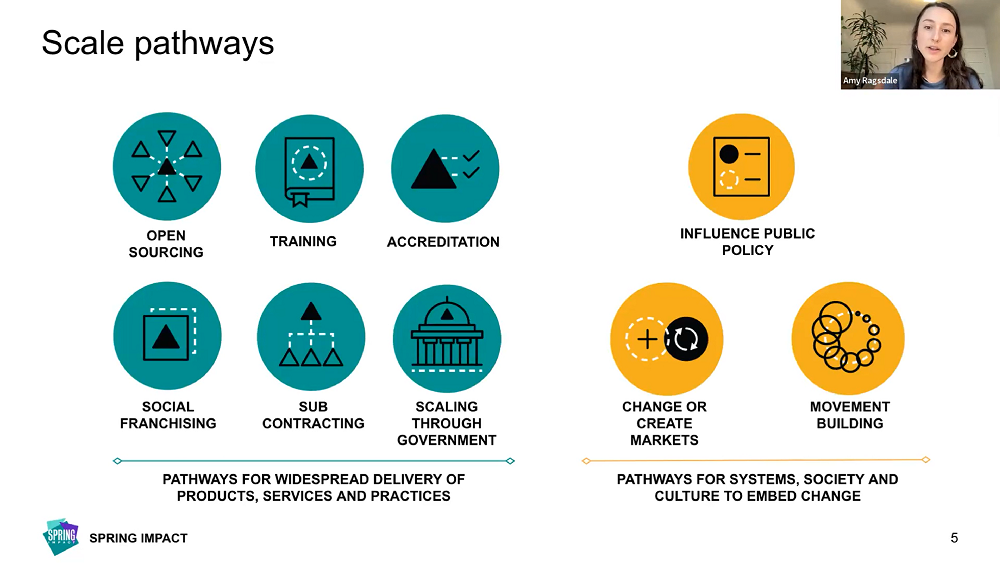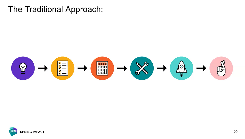 Remember, every experiment is designed to test a certain hypothesis. As a starting point, think about some of the biggest risks and unknowns involved in making your approach work, frame it as a hypothesis, and get an MVP into the hands of real partners/stakeholders to see what happens. The beauty of this approach is that it shifts “failure” from a judgment-based experience to a valuable learning opportunity that will only make your final product better in the long run. To learn more, check out Spring Impact’s open source Scaling Impact Toolkit here.