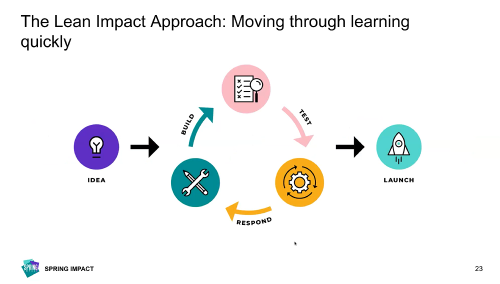 Instead, Amy strongly recommends taking a lean impact approach, which creates learning loops that enable you to test and validate that what you’re doing will work (or won’t work, in which case you can quickly pivot and iterate.)
