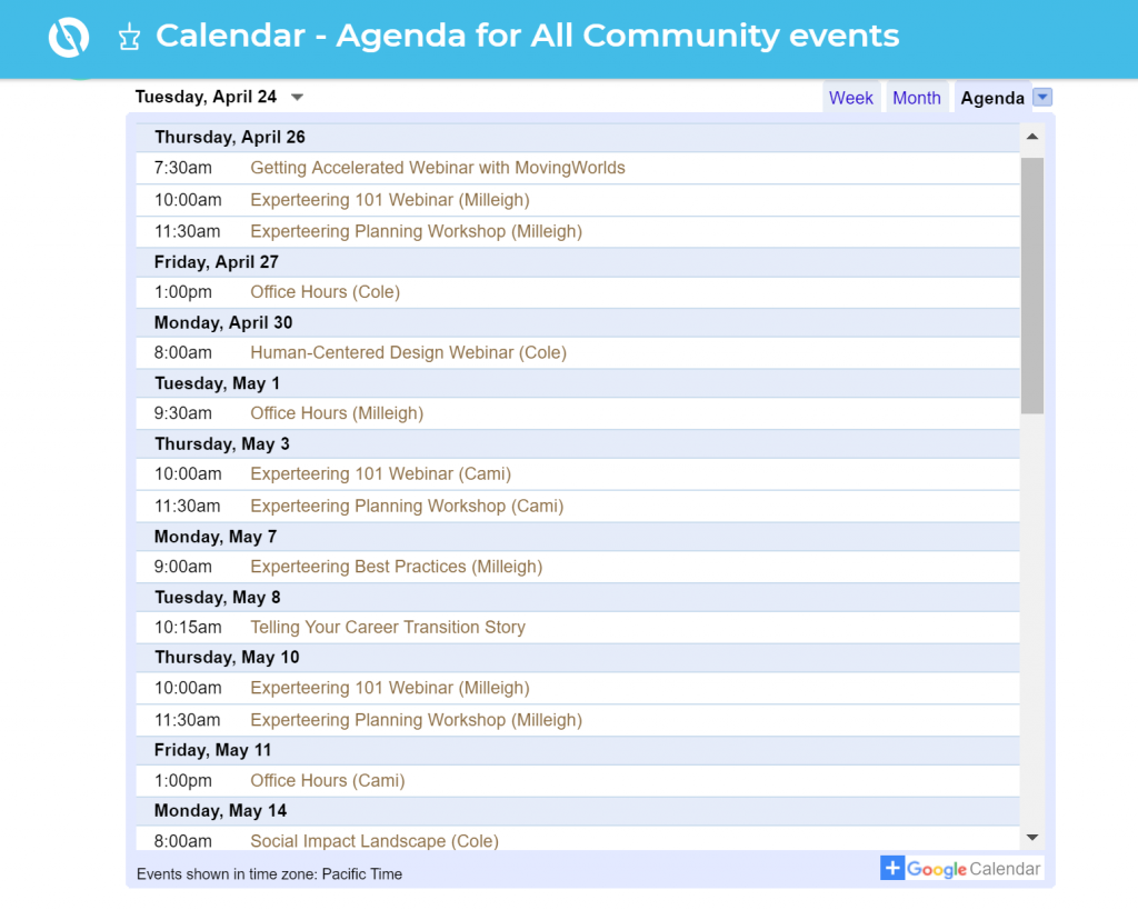 Members who join our PLUS program will have access to weekly virtual events hosted by MovingWorlds staff to learn from each other, as well as from guest speakers and real practitioners.