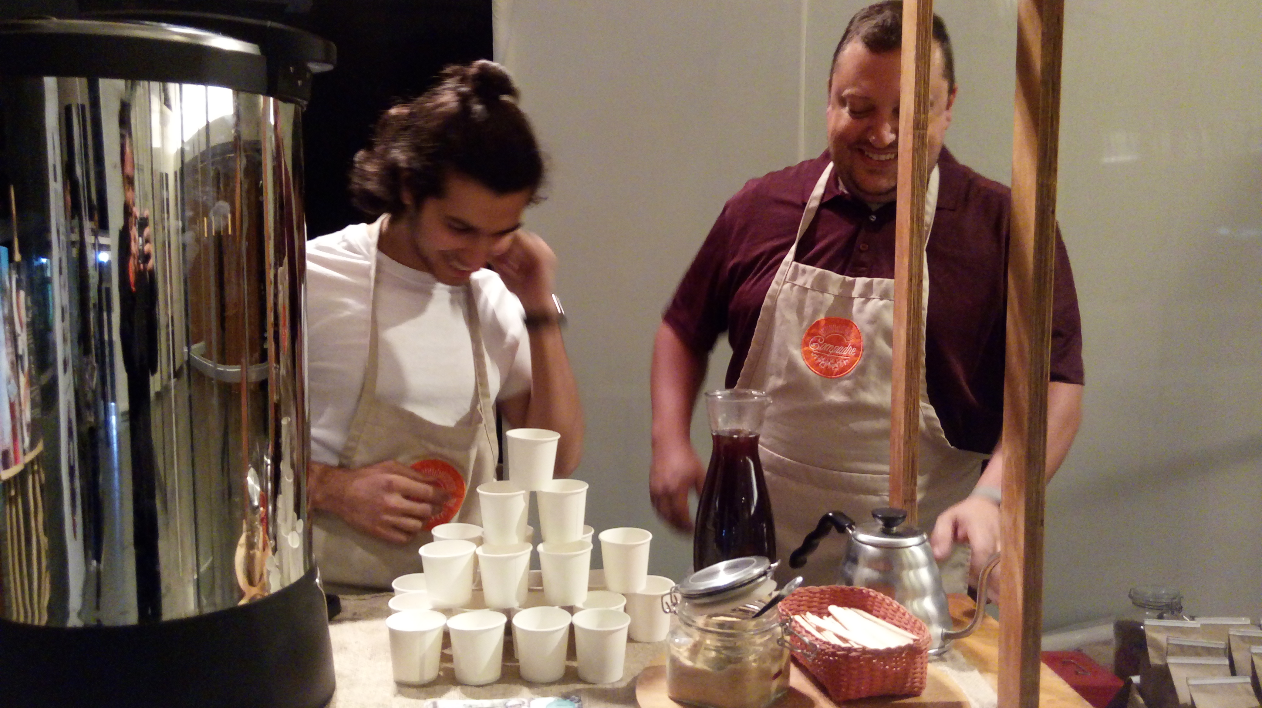 Jeremy and Varun brewing coffee at a Compadre coffee catering.[/caption]