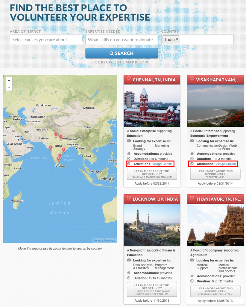 This partnership functionality helps global development partners - like Village Capital - augment their own offerings by providing their field organizations a new kind of support: Real people. And not just people, but skilled professionals that are eager to travel and donate their expertise to social impact organizations to help them overcome any business or technical challenge.