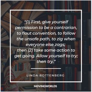11. “(1) First, give yourself permission to be a contrarian, to flout convention, to follow the unsafe path, to zig when everyone else zags; then (2) take some action to get going. Allow yourself to try; then try.” -Linda Rottenberg, Co-Founder of Endeavor