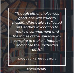 4. “Though either choice was good, one was truer to myself... Ultimately, I reflected on Geothe's invocation to 'make a commitment and the forces of the universe will conspire to make it happen' and chose the uncharted path.” ― Jacqueline Novogratz, Founder of Acumen