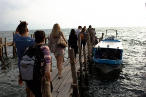 Group boarding a lancha to cross Lake Atitlan to Santiago[/caption]