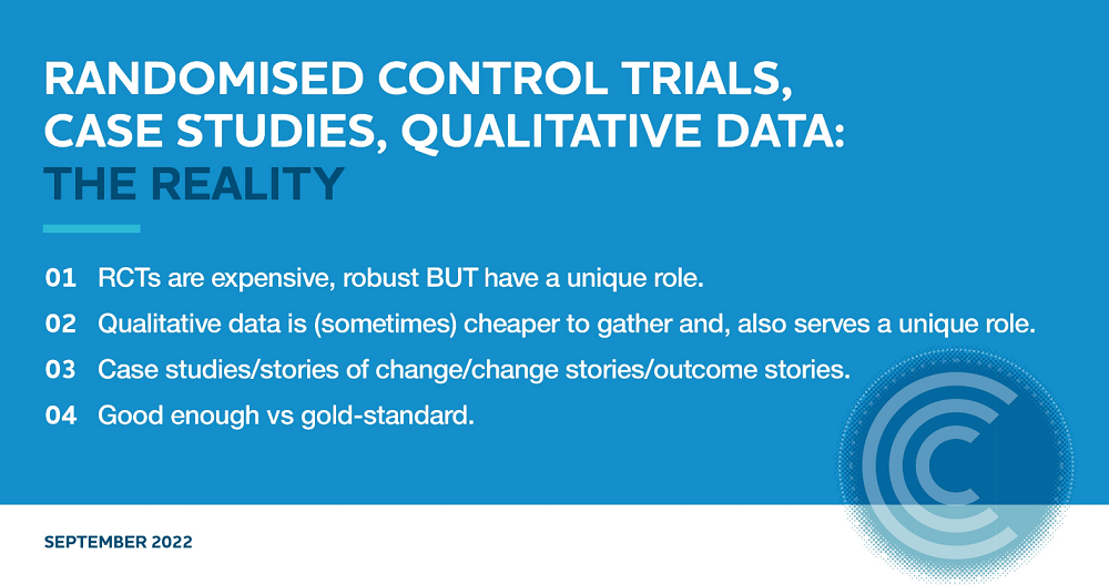 Social enterprises must know what their audience is looking for regarding evidence. A “gold standard” is likely necessary for venture capitalists or other financial institutions, in which case you may want to use a randomized control trial. Private investors might just look for the "good enough" evidence, which can be demonstrated using qualitative methods. Know who you are trying to convince with data so you understand the evidence needed to prove your impact.