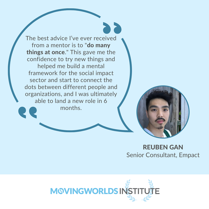 “The best advice I’ve ever received from a mentor is to "do many things at once." Applying this to my own career transition gave me the confidence to try new things, like volunteering my skills with a local nonprofit, joining a peer support network through the Fellowship, reading social impact books, initiating coffee chats with people I wanted to get to know, and submitting the odd job application once in a while. Coming to this space as a newcomer, this approach helped me build a mental framework for the social impact sector and start to connect the dots between different people and organizations and I was ultimately able to land a new role in 6 months.” - Reuben Gan
