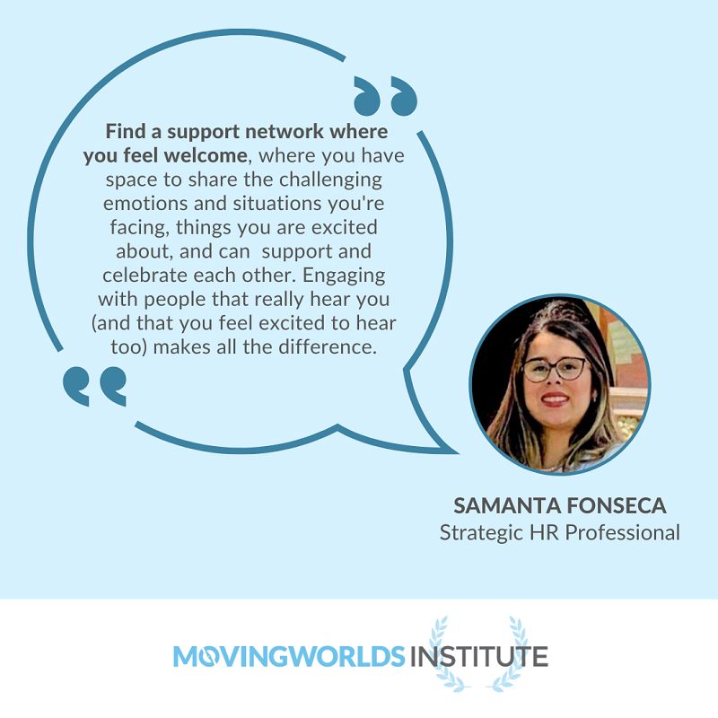 “I would suggest finding some way to develop "generative" and "re-generative” conversations where you feel safe to be authentic. Find a support network where you feel welcome, where you have space to share the challenging emotions and situations you're facing, things you are excited about, and can support and celebrate each other. Engaging with people that really hear you (and that you feel excited to hear too) makes all the difference.” - Samanta Fonseca