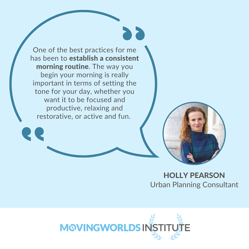 “One of the best practices for me has been to establish a consistent morning routine. The way you begin your morning is really important in terms of setting the tone for your day, whether you want it to be focused and productive, relaxing and restorative, or active and fun. A morning routine could include meditation, journaling, physical exercise, time outdoors in nature, eating a healthy breakfast....whatever will put you in a clear and positive mindset for the day ahead.” - Holly Pearson