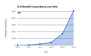 This marks the point in history of the Social Enterprise movement when business success and positive social impact become interwoven — simultaneously being legally protected and enforced — as a combined strategic imperative, rather than co-existing separately as they had previously. And this movement is growing rapidly, as shown by this chart showing the number of Benefit Corporations incorporated over time (according to TechCrunch):