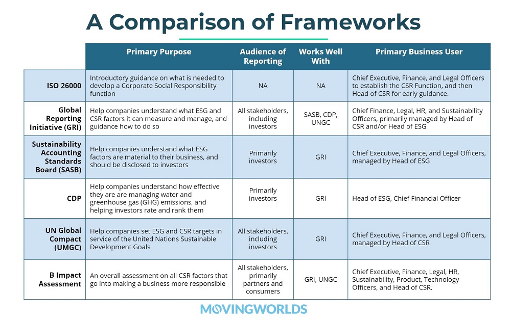 B Labs has popularized the idea of the Benefit Corporation, which is a new type of legal entity that exists explicitly for and publicly reports on social and environmental impact. B Corporation status is earned upon completing, and scoring high enough, on the B Impact Assessment. However, the B Impact Assessment is NOT an ESG report or framework, but rather an overall approach to corporate social responsibility. In fact, it may be useful to think of the B Corporation structure as the only CSR framework that provides guidance, evaluation, and audit, all in one.