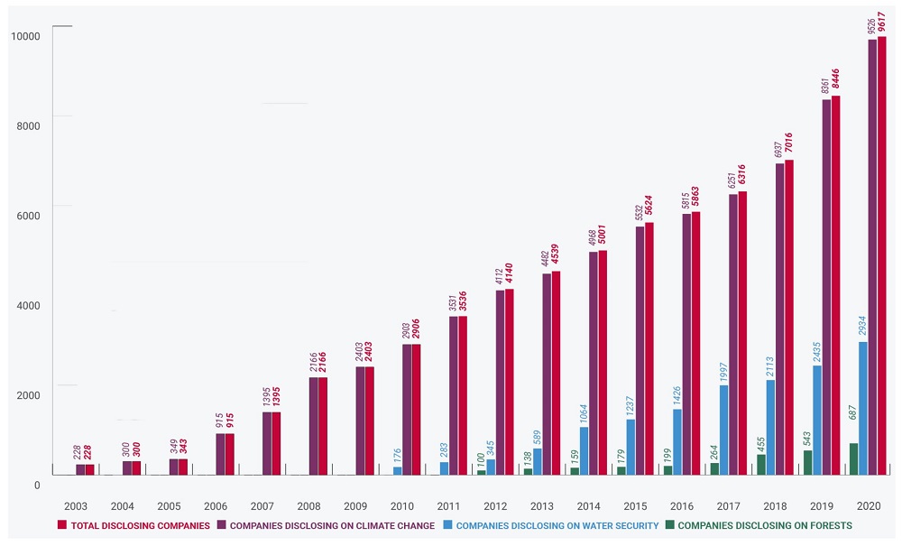 Environmental, Social, & Governance (ESG) reporting is a hot topic in the world of business right now, particularly in the wake of the pandemic and COP26 climate conference earlier this month. Consumers, investors, employees, and governments are increasingly demanding transparency and accountability from corporations about their social and environmental impact, and it’s quickly taking ESG reporting from a “nice to have” to a “non-negotiable to compete in the new normal.” The graphic below demonstrates the explosive growth in ESG reporting over the last decade, and the total number of companies disclosing on dimensions like climate change, water security, and forests: