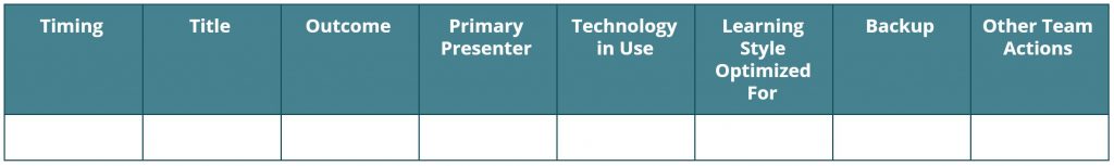 Enlist help, whether it’s a fellow presenter or a background facilitator. Align your team with a “run of show” that clearly outlines lines of responsibility and other key details as outlined in the table below.
