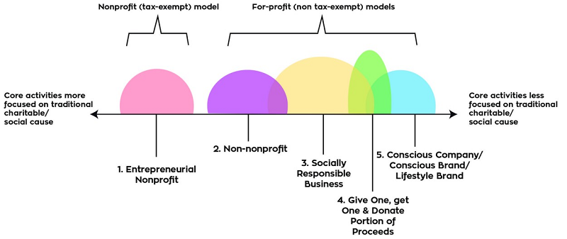 In an article on Conscious Media, author Nicole Motter shares a diagram that we think does a good job capturing the fact that social enterprises exist on a spectrum when it comes to legal incorporation and taxation. This is important: a social enterprise isn’t just one type of legal entity. A non-profit can operate as a social enterprise, and so can a for-profit, university, or even governmental group: