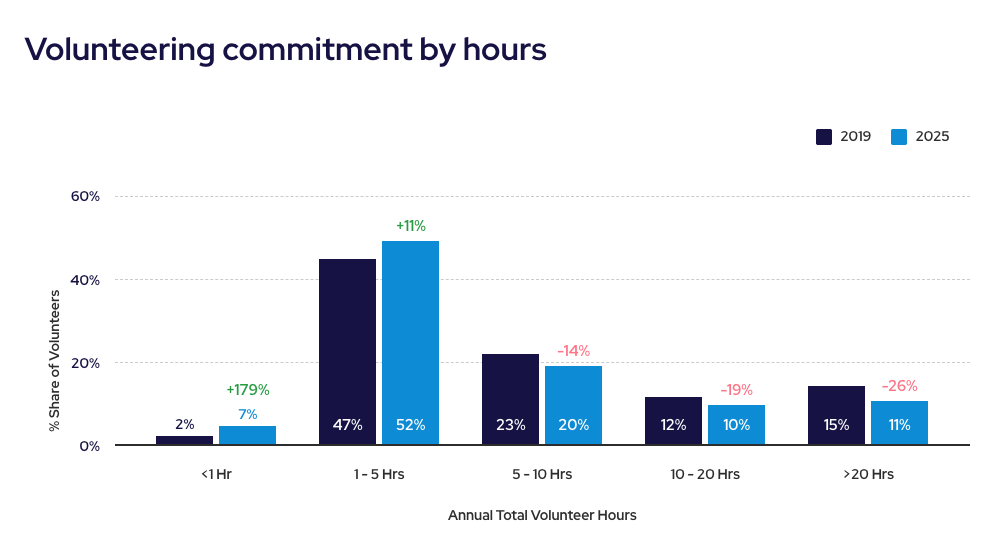 Second, 60% of corporate volunteers now log fewer than five hours per year. Benevity calls this the rise of the "micro-volunteer" — employees contributing an average of just 1.4 hours across the year.