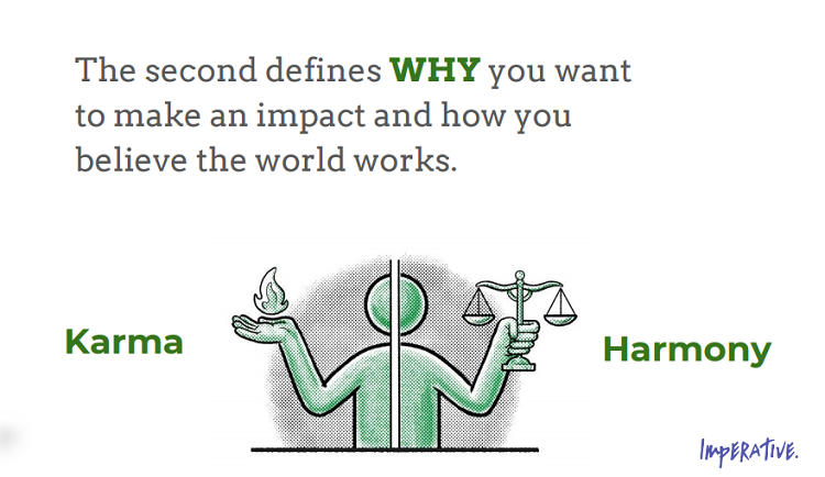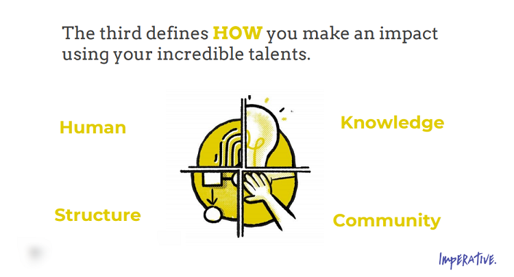 The third driver is HOW do you seek to make an impact. I like to think about it like this: if you think back to the most enjoyable work day you had, what were you doing? Customizing things for individuals? Working with a team? Building tools and guides? Researching on your own? This is HOW you make an impact, and it’s an important part of the equation. According to Imperative, there are four main drivers in this category: